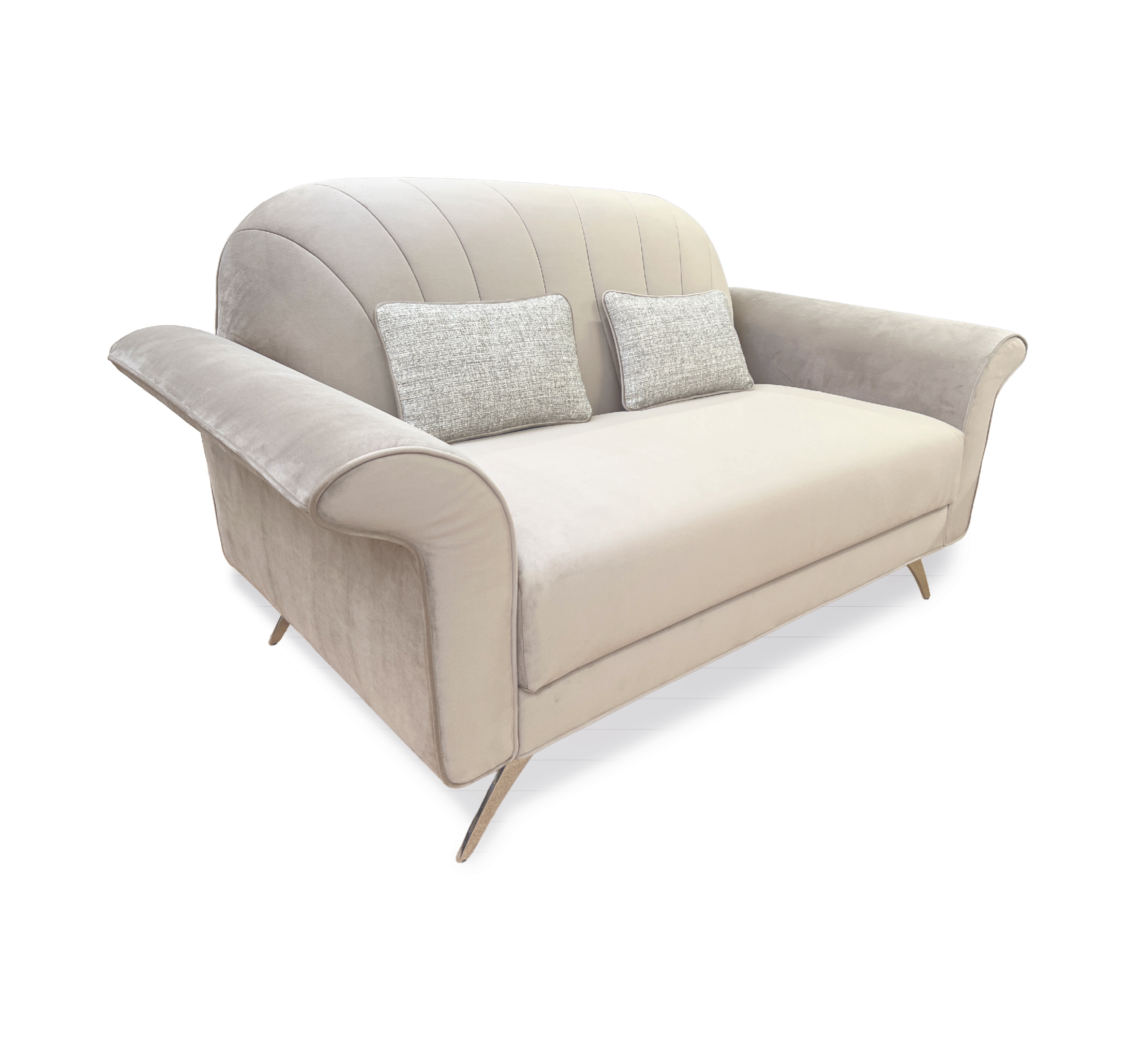 in velluto beige antimacchiaModello di ispirazione vintage, con solida struttura in legno multistrato e imbottiture a densità differenziata che garantiscono il comfort di schiene e sedute. Il rivestimento è un morbido velluto beige antimacchia tecnologia Fibreguard e tutto il perimetro è rifinito da un cordoncino a contrasto, sempre in tessuto antimacchia, che enfatizza le forme del divano, in particolare il movimento flessuoso ed elegante dei braccioli.